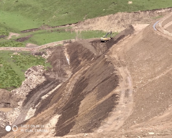 督察组来到玛曲县最大的国有金矿采选企业黄金实业公司,进入矿区就看到约50米长的矿石运输通道两侧到处抛撒着矿石,原有围挡设施基本破损毁坏。矿区大大小小数十处弃土弃渣沿山体随意堆放,其中有一处十余米高的渣堆紧邻办公房屋,存在安全风险。采矿区满目疮痍,露天开采遗留的采坑尚未治理;地下开采产生的大量废弃矿石、渣土随意堆放在矿洞口、坡脚沟谷和路边。督察组随即调阅该公司采选工程现状环境影响评估报告及其审查意见,文件要求对矿区废石堆场等采取围挡、苫盖等措施,但企业均未严格落实,整个矿区环境管理混乱。2019年7月卫星遥感监测分析显示,该矿贡北、格尔珂等2个采矿区裸露面积达93公顷,弃石弃渣等堆场、排场裸露面积约49公顷。