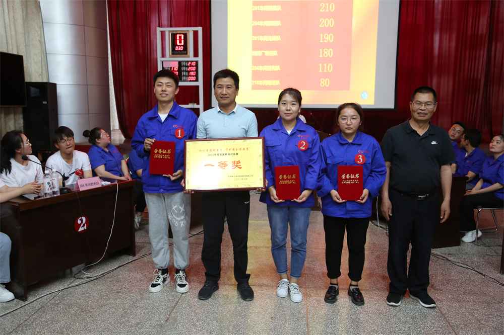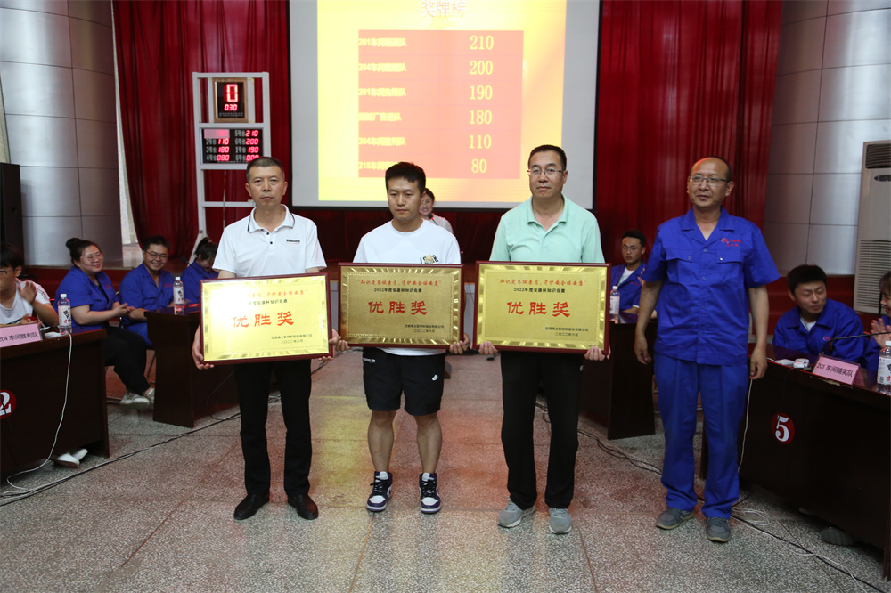 决赛现场,各参赛选手沉着冷静、机智应战、你追我赶,互不示弱,台上台下互动交流,高潮迭起,真正赛出了水平,赛出了风格,赛出了公司员工良好的精神风貌。此次安全知识竞赛设立个人必答题、小组共答题、抢答题、风险题四种题型,赛题紧紧结合公司实际,主要围绕新《安全生产法》《职业病防治法》等法律法规和工会劳动保护“三个条例”以及公司安全生产规章制度、安全生产应知应会、安全技术操作规程、防火防爆知识、职业卫生知识等多个方面,内容丰富,针对性强,在生活和生产中具有很强的实用性。经过激烈角逐,最终201车间精英队夺得了本次知识竞赛第一名,204车间超越队获得第二名,201车间先锋队获得第三名。