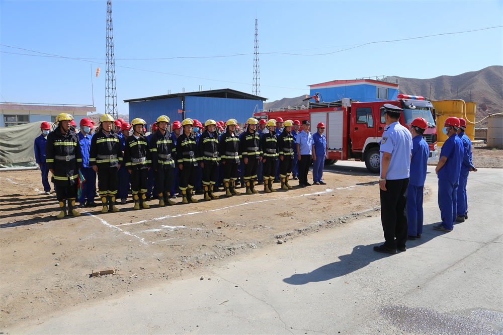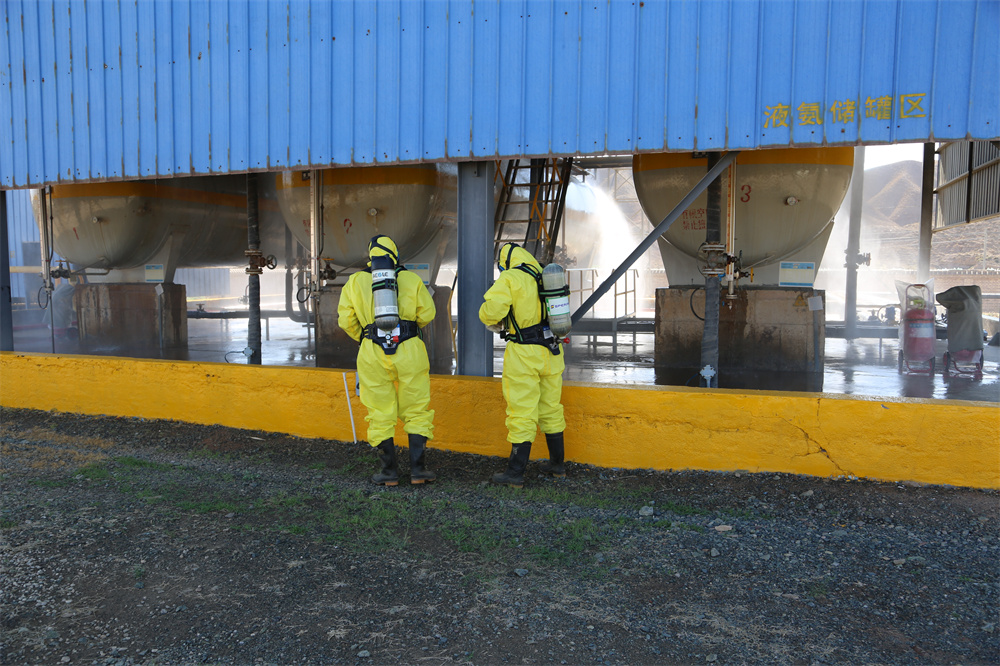 此次演练由201车间、安全生产部、武装保卫部、白银第一人民医院稀土分院联合开展,现场模拟液氨站2#贮槽液相出口第二道阀门进料侧法兰出现大量泄漏,液氨贮罐区可燃气体报警,喷淋系统自动启动。岗位操作人员第一时间发现险情,在穿戴好防冻服、空气呼吸器后,进入现场确认灾情,随后向车间报警,启动车间应急预案响应程序。车间应急救援小组到达现场后,立即采取先期措施,并向公司安全生产部、武装保卫部、白银第一人民医院稀土分院请求支援。公司武装保卫部到达现场后对事故区域进行水雾喷淋,稀释“氨气”浓度,消防人员进入事故现场,关闭液氨储罐底部阀门,开展堵漏工作。稀土分院将抢险中因体力不支而受伤的“伤员”送往医院进行救治,10时许,紧急状态结束,事故险情排除。演练过程中,各部门配合默契、分工明确,指挥协同密切,救援人员反应迅速、有条不紊,达到了预期效果。
