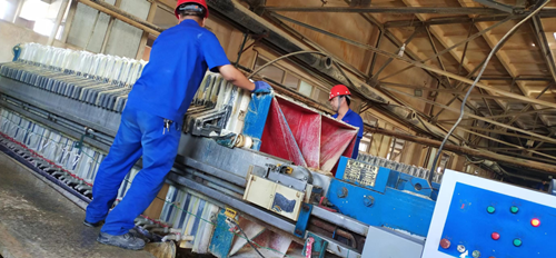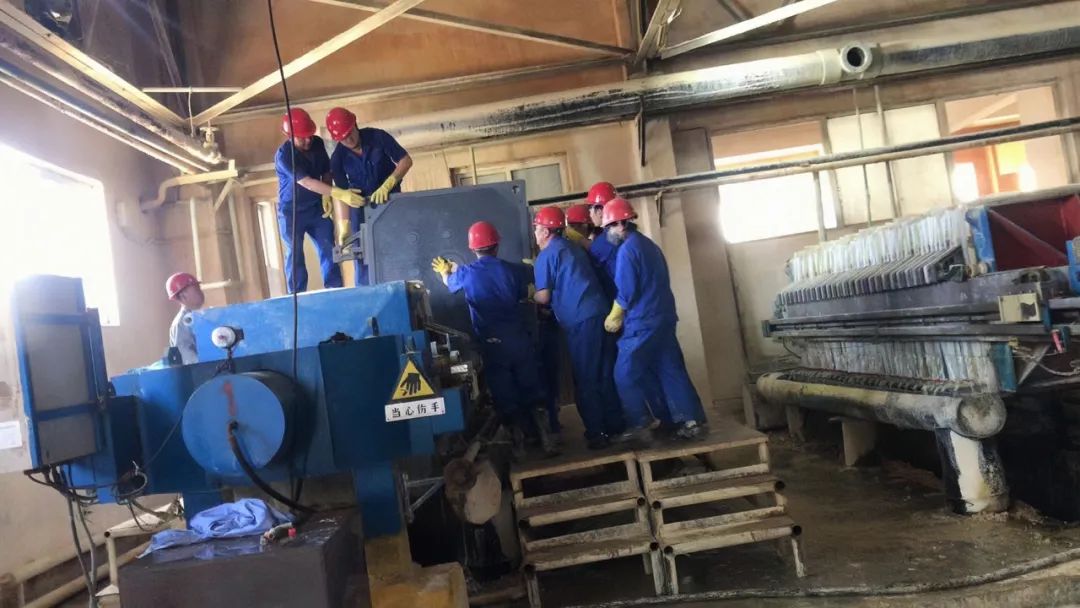 在主题党日活动现场,204车间支委班子成员率先垂范,带领工程技术人员、生产骨干、积极分子深入现场、靠前指挥、亲自操作,集中力量进行义务卸载压滤板、更换变形压滤板框、更换老化压滤布。党员同志发扬不怕脏、不怕累的精神,分工协作、默契配合,干劲十足,高温、高热、高湿的“三高”劳动环境丝毫不影响他们的工作热情,三人一组,两人一伙,男同志们有的推压滤机板,有的铲渣,有的换板,有的换布,有的洗板,女党员们也不甘示弱,纷纷与男同胞并肩作战,以最快速度反复卷布、叠布、递布,发扬了巾帼不让须眉,敢冲、敢干的精神。经过大家不懈努力,历经5个小时,7台一次压滤机和3台洗水压滤机全部完成换板换布,清液通过滤布过滤缓缓流出,残渣和杂质留在板框内,固液分离逐渐好转,各工序实现畅通,生产趋于平稳。