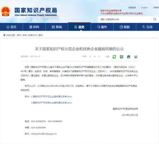 近日,国家知识产权局发布关于国家知识产权示范企业和优势企业复核结果的公示,拟确定全国875家国家知识产权示范企业、3400家国家知识产权优势企业通过复核,公司顺利通过国家知识产权优势企业复核。
