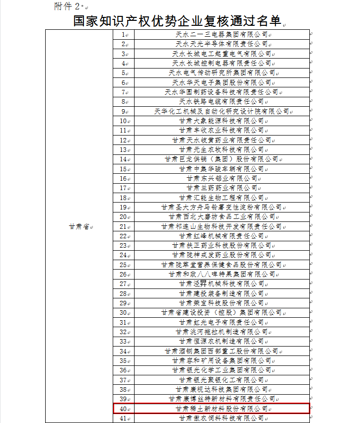 国家知识产权优势企业是指属于国家重点发展的产业领域,能承接国家和本市重大、重点产业发展项目,具备自主知识产权能力,积极开展知识产权保护和运用,建立全面的知识产权管理制度和机制,具有知识产权综合实力的企业,是国家对企业知识产权创造、运用、保护、管理等方面工作突出授予的极高评价。今年以来,公司严格按照《国家知识产权局办公室关于面向企业开展2022年度知识产权强国建设示范工作的通知》(国知办函运字〔2022〕497号)要求,经企业测评、推荐上报、审核确认等程序,顺利通过国家知识产权优势企业复核,成为甘肃省83家和白银市13家通过国家知识产权示范企业和优势企业复核的企业之一。