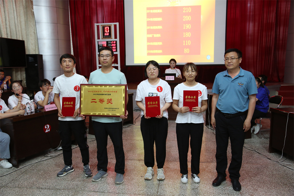 决赛现场,各参赛选手沉着冷静、机智应战、你追我赶,互不示弱,台上台下互动交流,高潮迭起,真正赛出了水平,赛出了风格,赛出了公司员工良好的精神风貌。此次安全知识竞赛设立个人必答题、小组共答题、抢答题、风险题四种题型,赛题紧紧结合公司实际,主要围绕新《安全生产法》《职业病防治法》等法律法规和工会劳动保护“三个条例”以及公司安全生产规章制度、安全生产应知应会、安全技术操作规程、防火防爆知识、职业卫生知识等多个方面,内容丰富,针对性强,在生活和生产中具有很强的实用性。经过激烈角逐,最终201车间精英队夺得了本次知识竞赛第一名,204车间超越队获得第二名,201车间先锋队获得第三名。