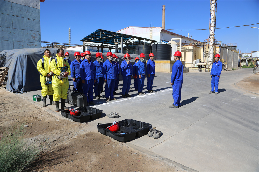 此次演练由201车间、安全生产部、武装保卫部、白银第一人民医院稀土分院联合开展,现场模拟液氨站2#贮槽液相出口第二道阀门进料侧法兰出现大量泄漏,液氨贮罐区可燃气体报警,喷淋系统自动启动。岗位操作人员第一时间发现险情,在穿戴好防冻服、空气呼吸器后,进入现场确认灾情,随后向车间报警,启动车间应急预案响应程序。车间应急救援小组到达现场后,立即采取先期措施,并向公司安全生产部、武装保卫部、白银第一人民医院稀土分院请求支援。公司武装保卫部到达现场后对事故区域进行水雾喷淋,稀释“氨气”浓度,消防人员进入事故现场,关闭液氨储罐底部阀门,开展堵漏工作。稀土分院将抢险中因体力不支而受伤的“伤员”送往医院进行救治,10时许,紧急状态结束,事故险情排除。演练过程中,各部门配合默契、分工明确,指挥协同密切,救援人员反应迅速、有条不紊,达到了预期效果。