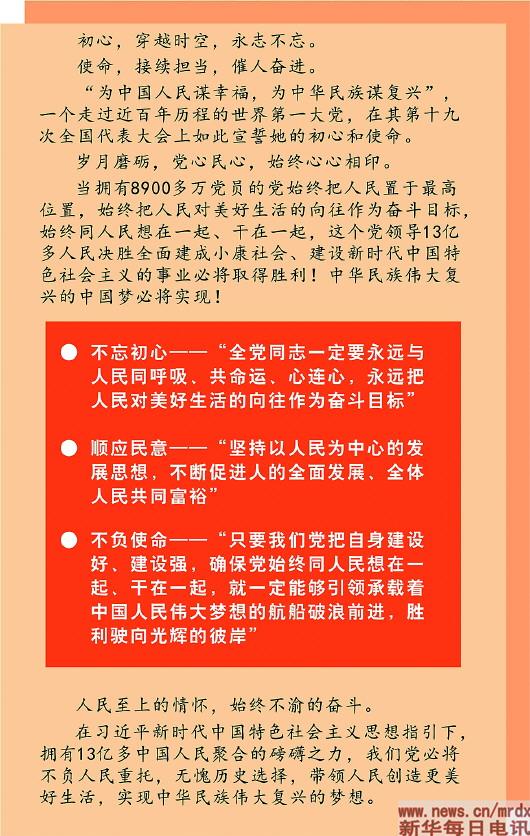 “为中国人民谋幸福,为中华民族谋复兴”,一个走过近百年历程的世界第一大党,在其第十九次全国代表大会上如此宣誓她的初心和使命。